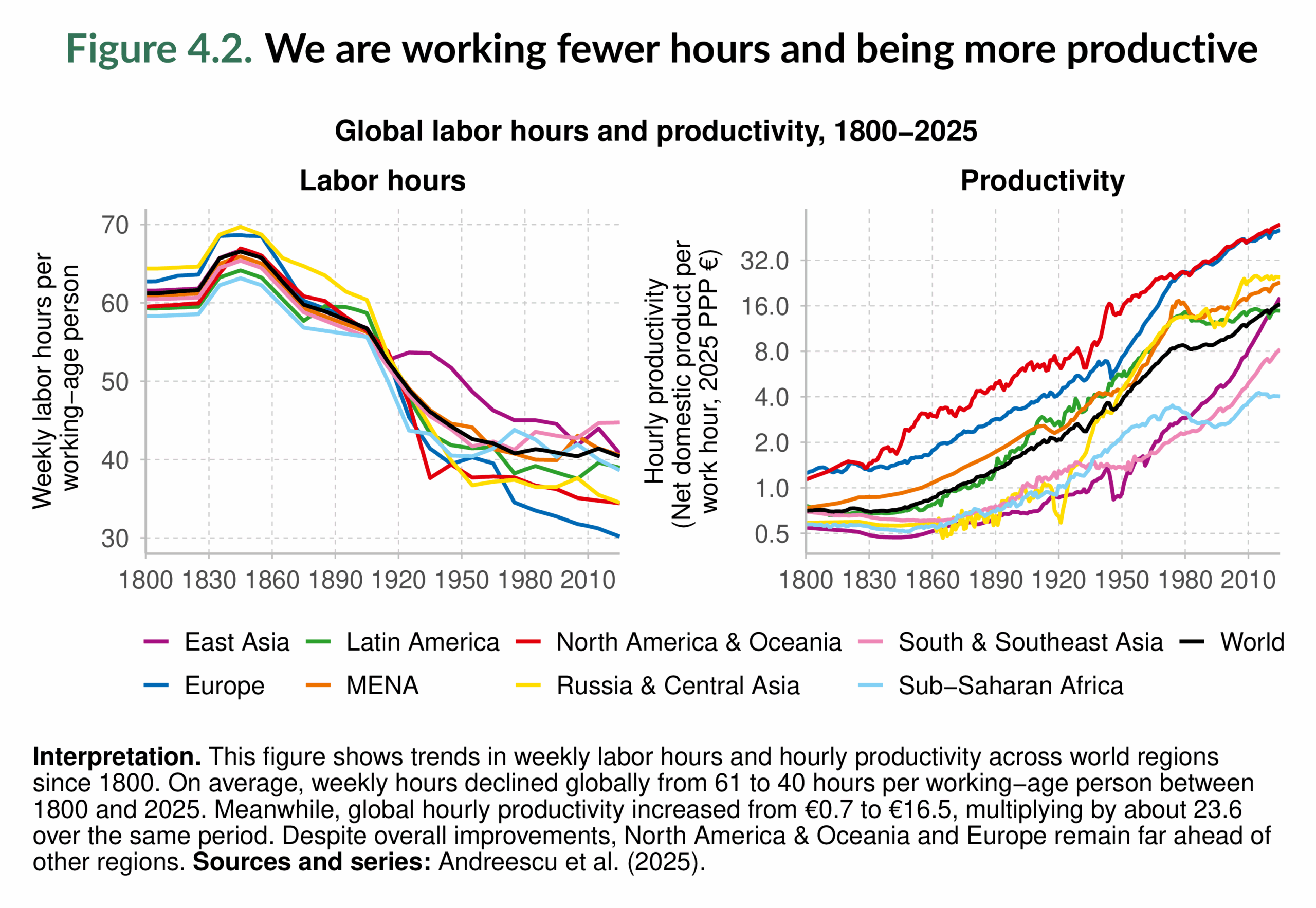 One of the most striking long-run transformations in the global economy is the decline in working hours. Two centuries ago, the typical worker spent more than sixty hours per week in market employment. Today, average hours have fallen dramatically, with all regions working around thirty to forty-five hours per week. This reduction reflects profound structural changes: industrialization, rising productivity (right-hand panel of Figure 4.2), the spread of labor rights and collective action, as well as, in some contexts, institutional change and deliberate policies aimed at shortening the working week. As the left-hand panel of Figure 4.2 illustrates, Europe today records the lowest average hours worldwide, often below thirty per week, while South & Southeast Asia remain closer to forty-five. The overall picture is one of a world population that, on average, spends less time in formal work than in the past.